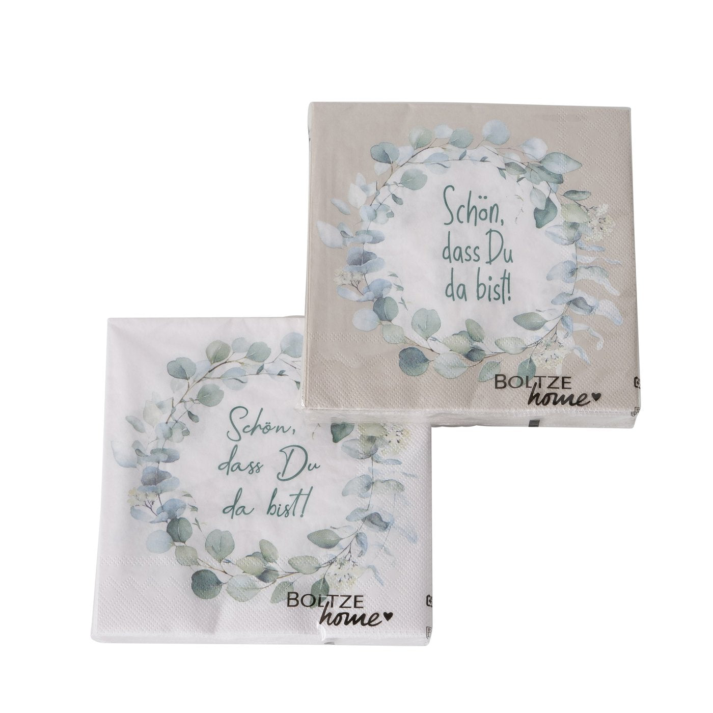 Die dekorativen Papier-Servietten aus der Boltze Eukana Kollektion "Schön, dass Du da bist" bieten eine elegante Möglichkeit, den Tisch ansprechend zu gestalten und deinen Gästen eine herzliche Begrüßung zu bereiten. Erhältlich in den Farbkombinationen Weiß-Grün oder Beige-Weiß-Grün, sind die Servietten mit entweder verschnörkelten oder schlichten Schriftzügen versehen. Jede Packung enthält 20 Stück, jeweils 33 x 33 cm groß. Perfekt geeignet für festliche Anlässe und anspruchsvolle Tischdekorationen – setze mit diesen Servietten von Boltze stilvolle Akzente auf deinem Event.