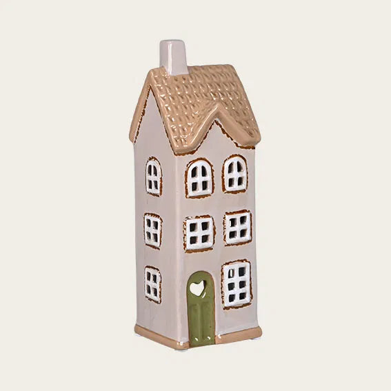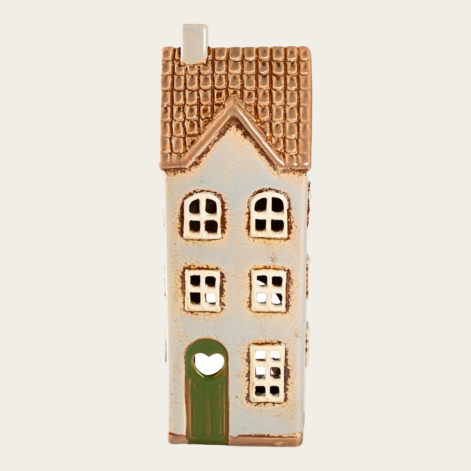 Das Det Gamle Apotek Keramikhaus in grau mit grüner Tür präsentiert sich als detailreich gestalteter Teelichthalter. Aus hochwertiger Keramik gefertigt, verfügt es über Fensterfronten an der Vorder- und Seitenfläche, die das Licht des Teelichts dezent und atmosphärisch nach außen scheinen lassen. Diese Kombination aus funktionalem Design und nordischem Charme macht es zu einem attraktiven Dekorationsobjekt für stimmungsvolle Beleuchtung in jedem Raum.