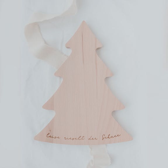 Lieferumfang: 1 Holzbrett in Form eine Tanne mit Schriftzug "Leise rieselt der Schnee"