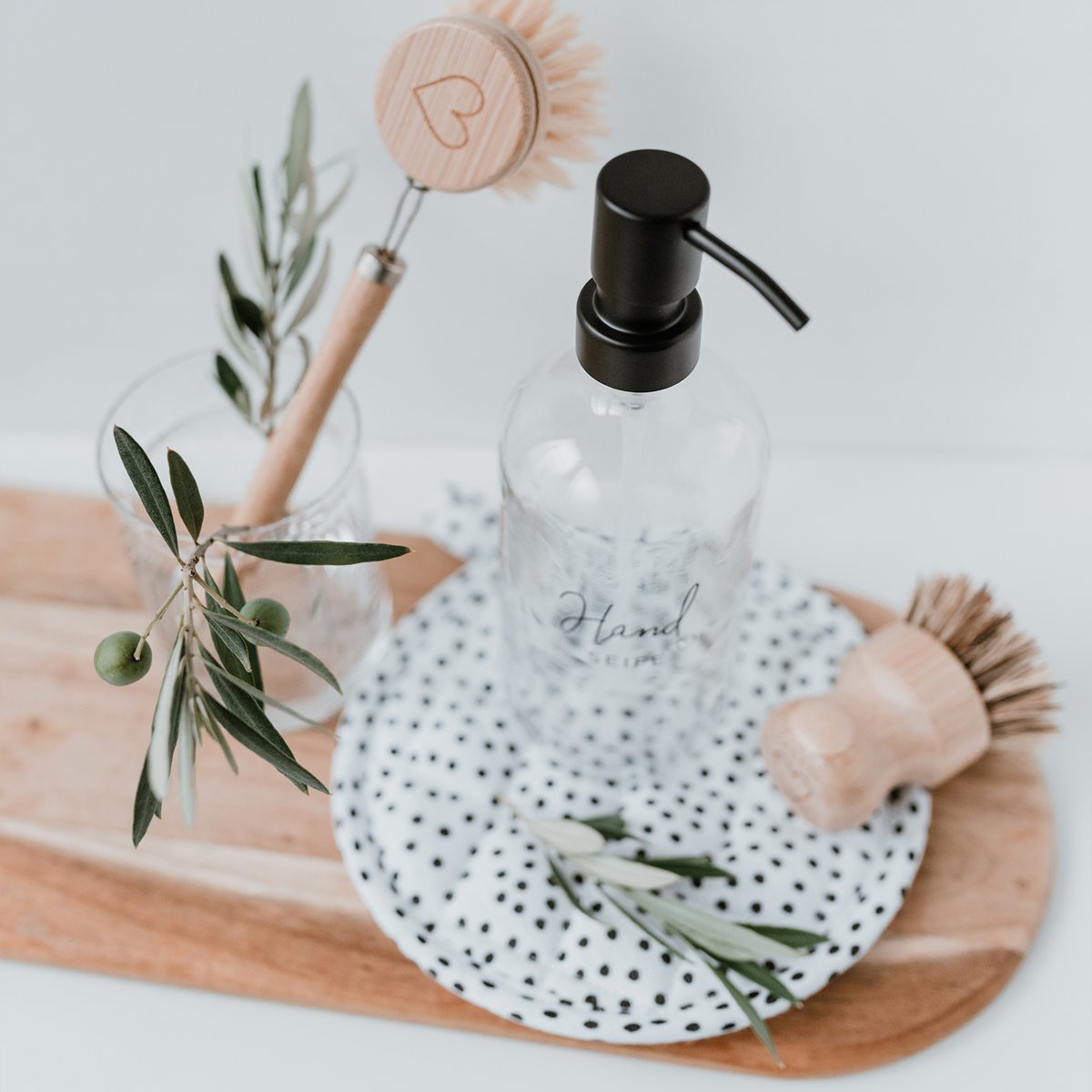 Der Eulenschnitt Seifenspender „Handseife & Herz“ aus klarem Glas mit einer eleganten Metallpumpe vereint Design und Nachhaltigkeit. Mit einem Fassungsvermögen von 500 ml eignet er sich ideal für Bad, Küche oder Hauswirtschaftsraum. Der praktische Schraubverschluss ermöglicht das einfache Nachfüllen, auch vielseitig nutzbar beim Einkauf unverpackter Waren. Der frontseitige, handschriftliche Schriftzug „Handseife“ mit Herzmotiv sowie das dezente Eulenschnitt-Logo auf der Rückseite verleihen dem Spender eine persönliche Note und unterstreichen seine hochwertige Verarbeitung.