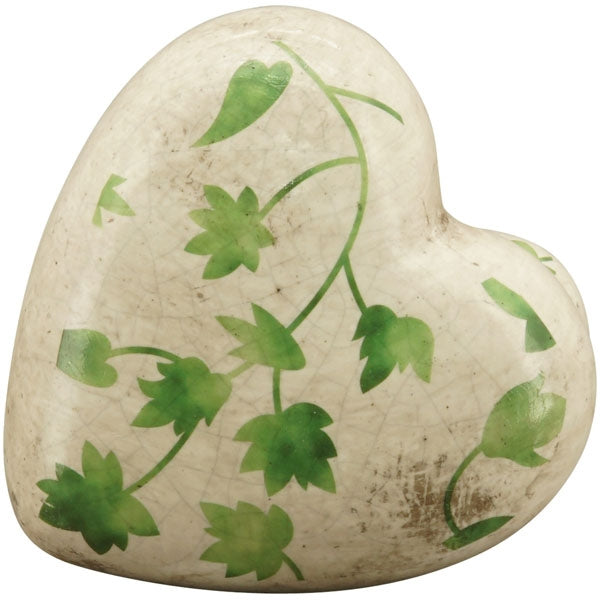 Dieses dekorative Vintage-Herz besticht durch seine weiß-grüne Farbgebung und die bedruckte Efeuranke. Es eignet sich hervorragend zur Platzierung auf der Fensterbank, im Eingangsbereich oder als Highlight auf einem Tablett zwischen Blumen und anderen Dekoelementen. Gefertigt aus hochwertigem Steingut, gehört das Herz zur Exner MusH-Serie.