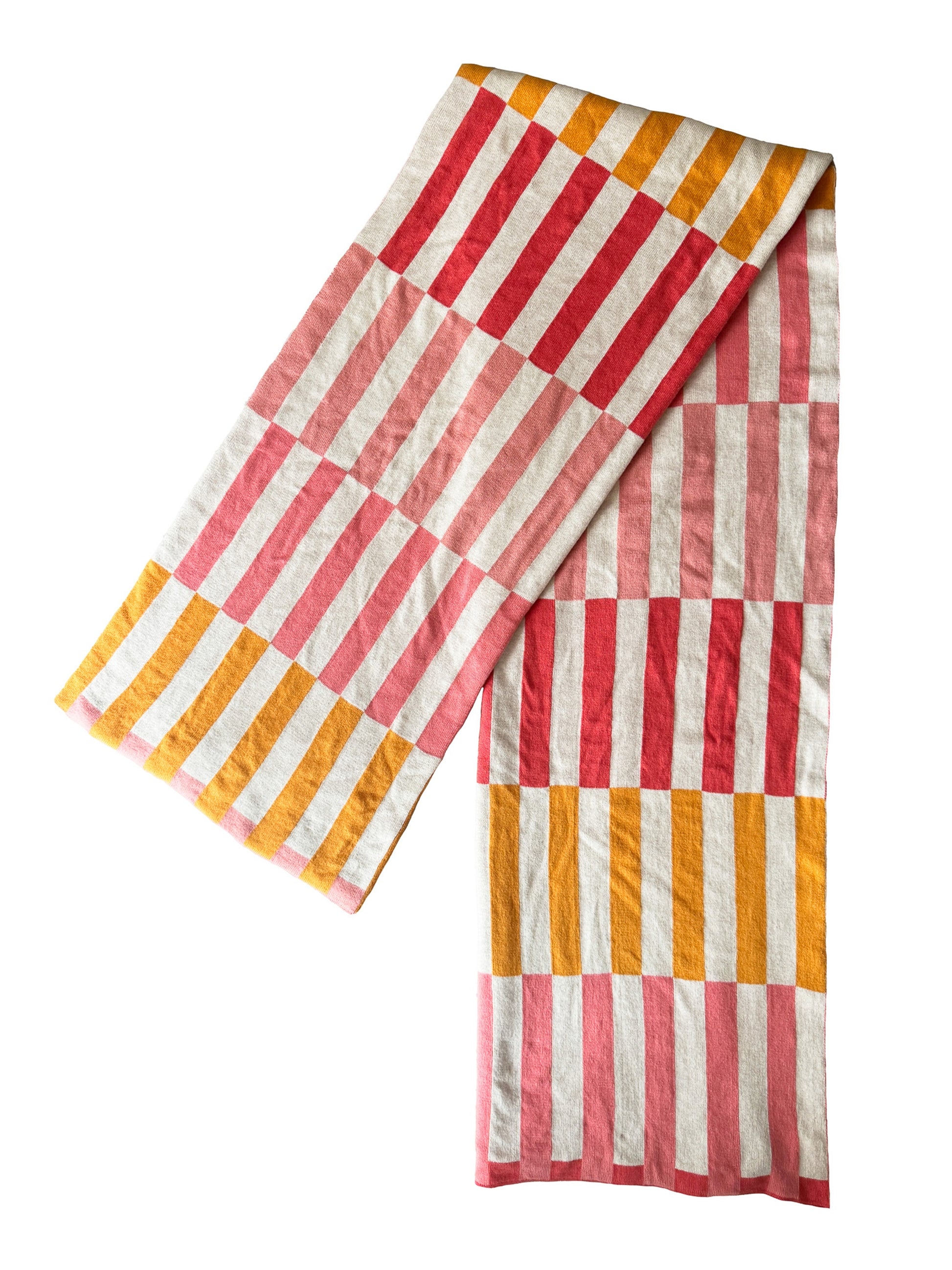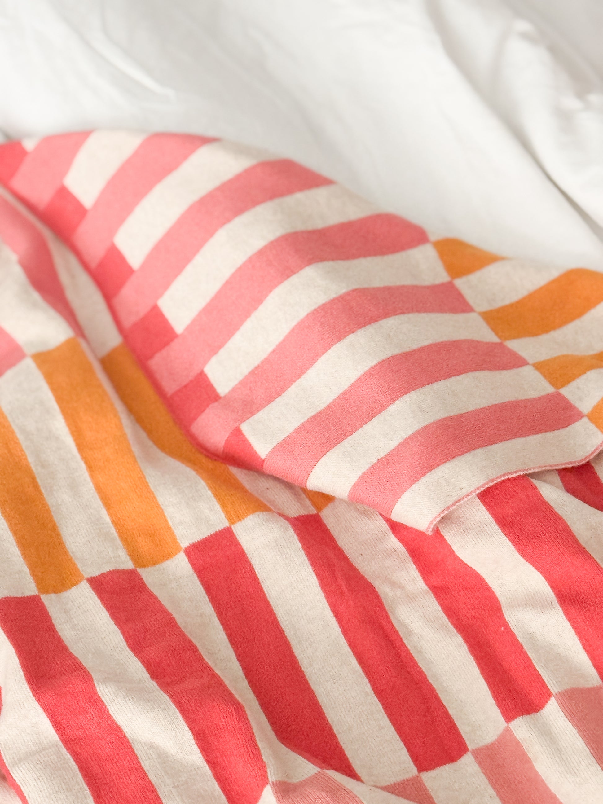Die Funky Doris Wolldecke Mojo in lebendigen Rot-, Pink-, Rosa- und Gelbtönen bringt frischen Schwung in Ihr Zuhause. Mit den Maßen 130 x 170 cm bietet sie angenehme Wärme und Komfort. Hergestellt aus 100 % Baumwolle und Öko-Tex zertifiziert, verbindet sie Nachhaltigkeit mit hochwertiger Qualität. Das gestreifte Design setzt stilvolle Akzente und macht die Decke zu einem modischen Highlight in jedem Raum. Ideal für alle, die Wert auf Umweltbewusstsein und zeitgemäße Wohnkultur legen.