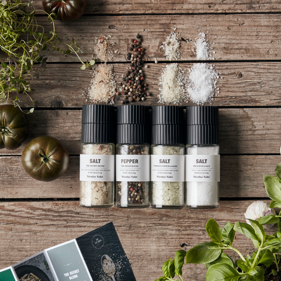 Lieferumfang: 1 Nicolas Vahé Geschenkbox gefüllt mit 3 Salzmühlen & 1 Pfeffermühle, Französisches Meersalz / Pfeffer The Mixed Blend / Salz Parmesan & Basilikum / The Secret Blend